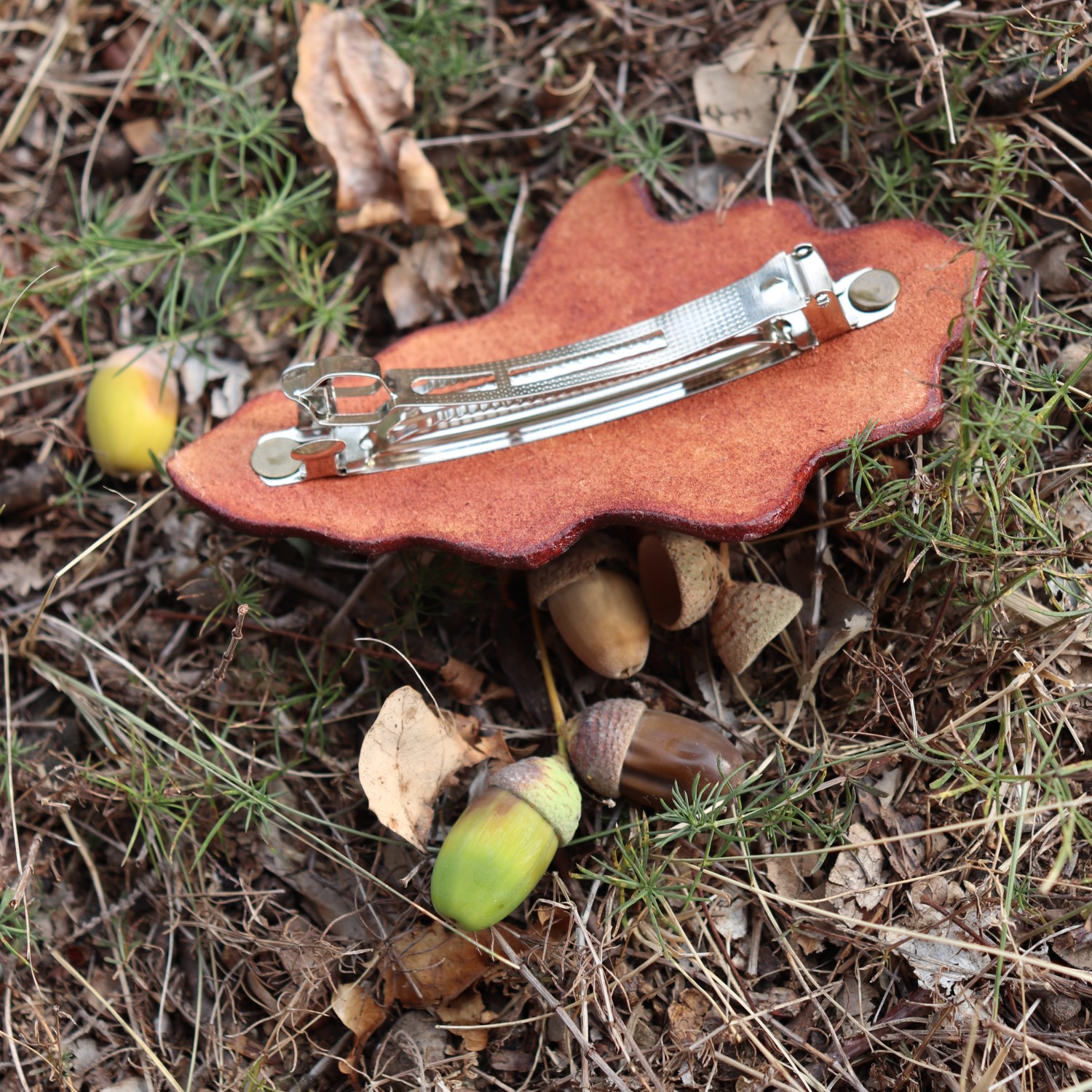 A large leather leaf hair clip from the Ancient Oak collection, designed like an oak leaf, on a 10 cm wide French clasp. It will be sufficient for most elves and many hobbit women to secure all their hair. And when you have a "bad hair day," you can always claim that your intention always was to look like a dryad.